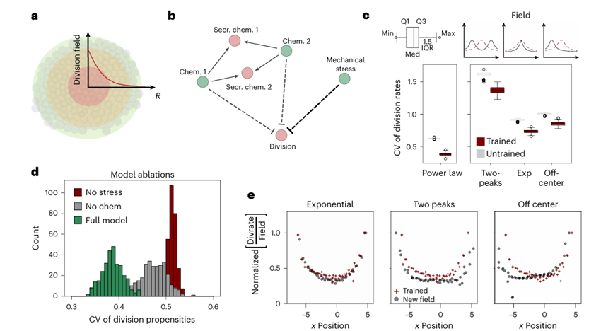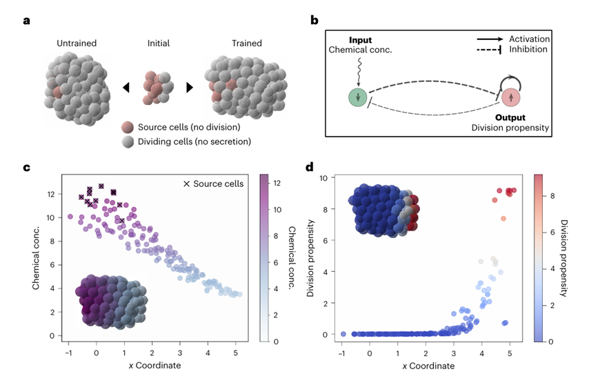 符合直觉的方法是,假如想要让虚拟细胞组成的聚簇向右边生长,可在当前右边放一些刺激生长的化学物质,但研究人员模拟得到的算法,却是细胞感知到的化学信号浓度越高,其分裂倾向越低(图4b)。
