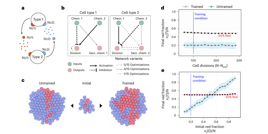 在模拟环境中,存在两类细胞:红色细胞(类型1) 和 蓝色细胞(类型2)。每种细胞都拥有一个专属的“化学语言”(图5a)每种细胞都能“听懂”对方的语言。如图5b所示:红色细胞不仅能分泌化学因子1,还能感知环境中化学因子2的浓度;同样,蓝色细胞不仅能分泌化学因子2,也能感知化学因子1的浓度。