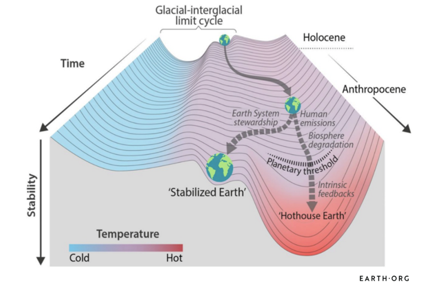图1:地球气候可能的变化路径示意图。人类活动可能把它推向‘温室地球(Hothouse Earth)’,也可能通过系统性减排与生态修复将其稳住在‘稳定化地球(Stabilized Earth)’。来源:https://earth.org/
