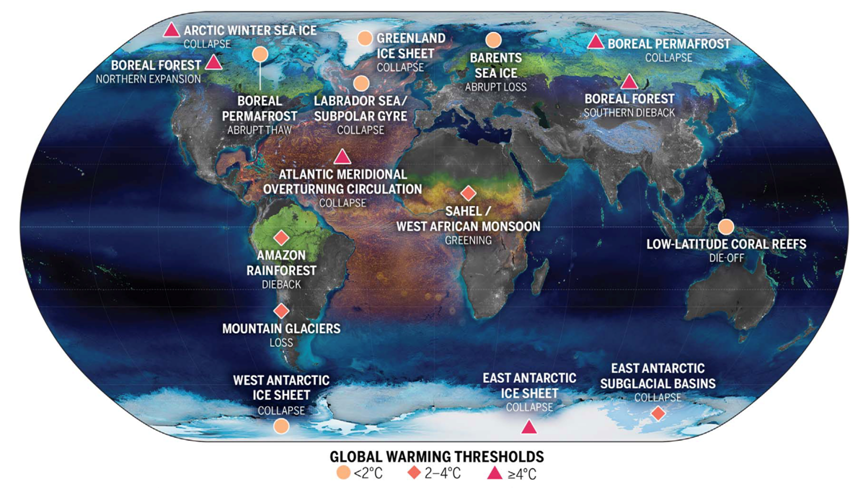 图3:地球系统潜在临界点示意图,Lenton, Timothy M., Hermann Held, Elmar Kriegler, et al. 2008. “Tipping Elements in the Earth’s Climate System.” Proceedings of the National Academy of Sciences 105 (6): 1786–93. https://doi.org/10.1073/pnas.0705414105.