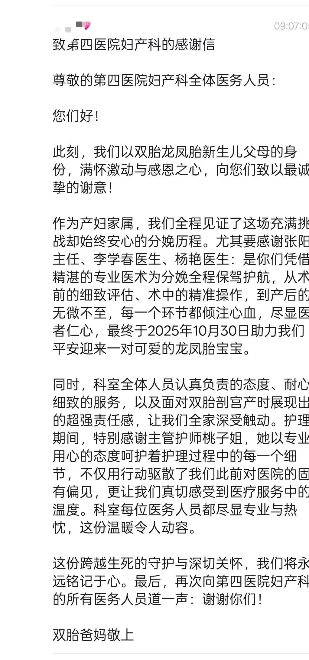 “我们以一对龙凤胎新生儿父母的身份,满怀激动与感恩,向你们致以最诚挚的谢意!” 近日,长沙市第四医院妇产科收到了一份特殊的电子“礼物”—— 一封由新生儿父母写的感谢信。