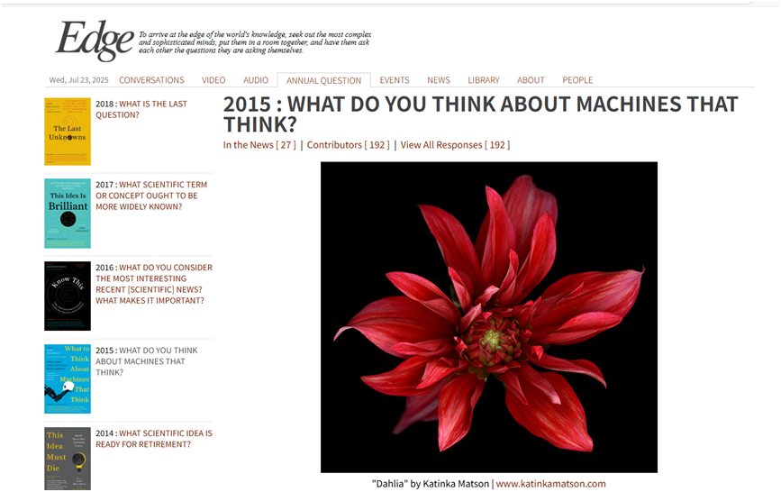 例如Edge杂志在2018年以前,每年会针对一个问题,邀请全球知名的科学家思想家给出回复,每个回答是一篇或长或短的评论文章,这些回答被集结成书,这样的年度问题,持续了数十年。这种方法完全可以被用于重新解读那些思想家的回答:让AI去聆听十年前的思考,在当下时代重新生成对话。