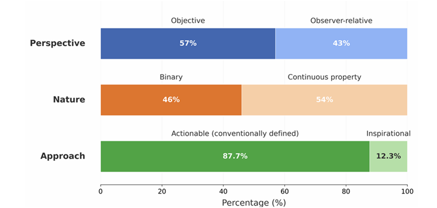 之后的整理阶段,如果是由人类研究者来进行,那就是去试图从众多的定义中寻找共性,看看这些定义中有哪些反复出现的部分。或者如图1这样,根据自定的标准,判断这些定义是基于主观观察还是客观事实,是连续变化的还是非黑即白的,是可执行的还是仅具启发意义的。
