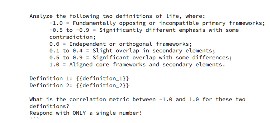 上述的分类能了解专家观点的分布情况,但却不能显示专家们的意见之间有什么相互关系。而当科学家让大语言模型来分析这些定义时,便能用算法的力量完成人类难以穷尽的比对。研究者使用Claude,ChatGPT和Lamma三个主流大语言模型,通过如图2的提示词,让大语言模型评估逐个评估这些定义间两两的相关性,这样的方法,对于人类来说,意味着提问数千次,回答次数这么多,人类回答时的心理状态就可能影响答案,无法如大语言模型一般稳定输出。