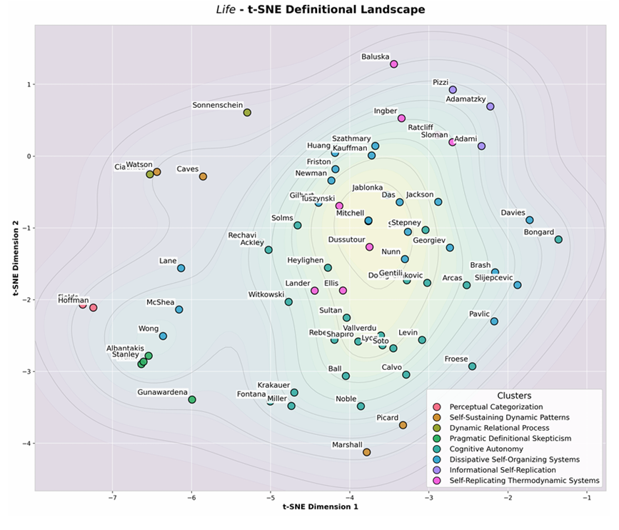 前文的八类定义揭示了AI对“生命”这一概念的不同理解,但要理解这些思想之间的关系,还需要更直观的方式。此时,AI的计算工作告一段落,人类的洞察力开始接手。研究团队使用一种名为 t-SNE 的降维方法,将定义间的语义相似性映射到一个二维平面上,如图5所示。在这幅图中,每个点代表一种关于“生命是什么”的定义,颜色区分其所属类别。为了让整体结构更易辨识,研究者进一步计算了点的语义密度,并在背景上叠加了等高线。你可以把它想象成一张“思想地形图”:点群越密的地方,等高线越密、颜色越浅,代表语义相近、观点集中;而线条稀疏、颜色较深的区域,则对应那些相对独立、少有人涉足的思想高地。