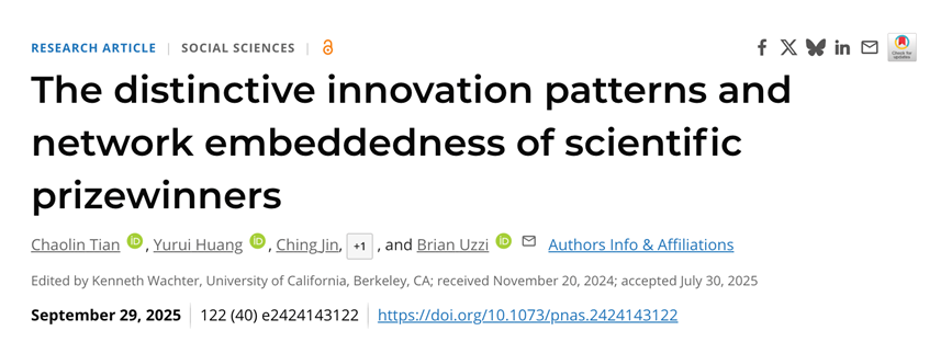 论文信息:C. Tian, Y. Huang, C. Jin, Y. Ma, & B. Uzzi, The distinctive innovation patterns and network embeddedness of scientific prizewinners, PNAS (2025).