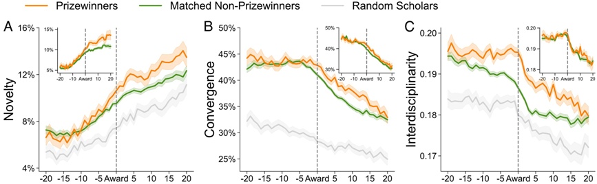 图2:获奖者、镜像对手及随机科学家的创新特征对比。纵轴分别表示:(A) 新颖论文占比、(B) 收敛论文占比、(C) 平均跨学科得分。获奖者相比镜像对手及随机选取的科学家,在获奖前后,新颖论文和收敛论文占比更高,跨学科得分更高。