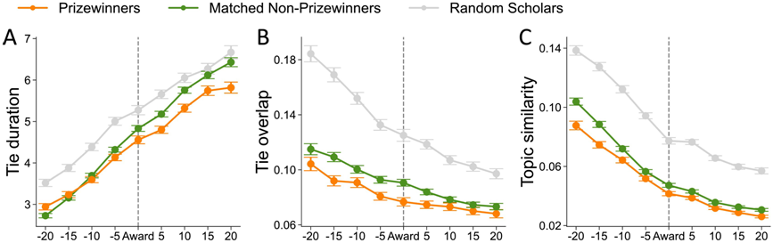 图3:获奖者与镜像对手合作网络特征对比。获奖者相比镜像对手,在职业生涯中合作关系持续时间(A)、关系重叠(B)和主题相似度(C)都更低
