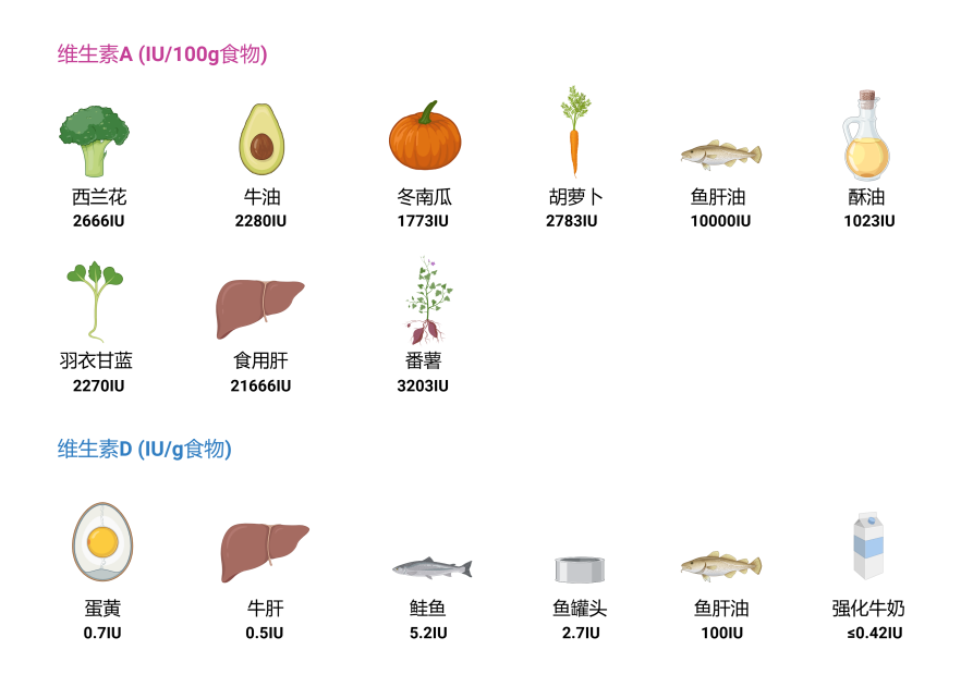 要解答这个问题,我们就需要了解体内维生素A、维生素D的主要来源——膳食。通过图3我们可以看到,许多食物中都含有维生素A,维生素D在大多数食物中都不是天然存在的,故其通常作为食品强化剂被添加到加工食物中。