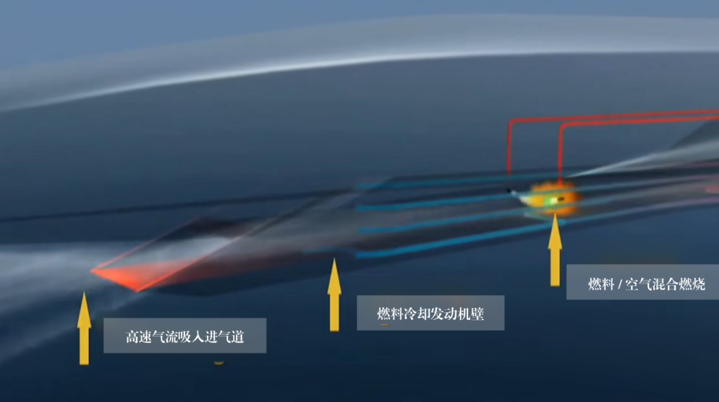 图:吸气式高超音速巡航导弹,采用超燃冲压发动机,与燃料混合燃烧产生强大推力
