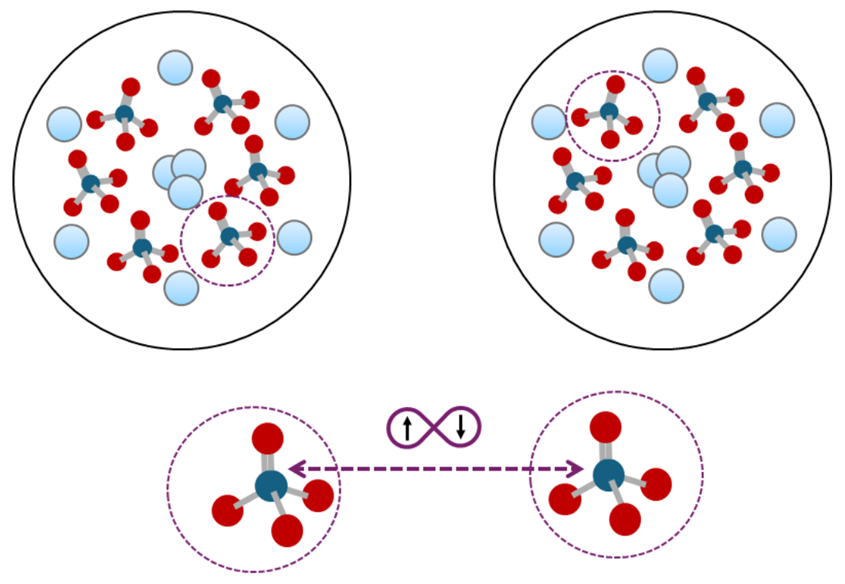 (注:上图展示了两个不同的波斯纳簇之间如何可以通过两个磷酸根离子产生纠缠,其中每个簇由九个钙原子和六个磷酸根离子组成;出处为原文)
