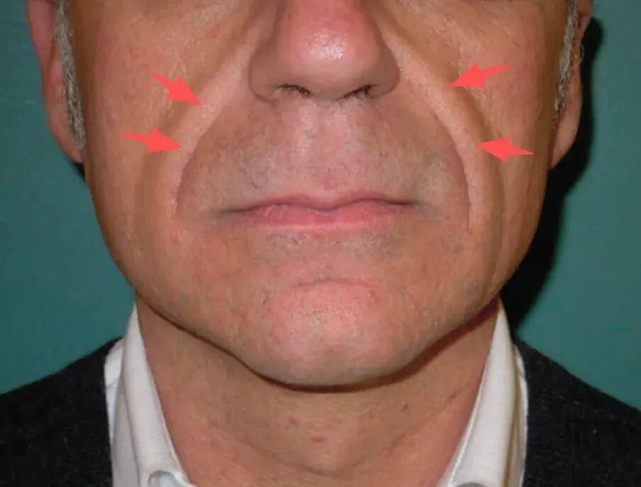 还有的是个体的组织结构差异。比如有的人天生更容易出现法令纹,因为他们鼻旁区域的体积相对缺失,浅层脂肪等软组织不足,进而容易形成阶梯状分界线,也就是法令纹(它的另一个称呼是鼻唇沟)。