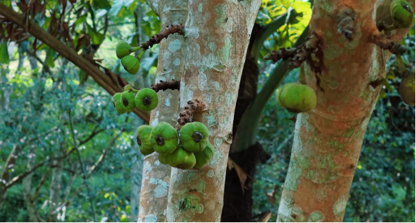 请大家注意看它的树干,是不是发现果子不是长在细细的树枝顶端,而是一坨一坨地直接长在粗粗的老茎或者树根附近?这种现象叫做“老茎结果”,是热带雨林里一道独特的风景。