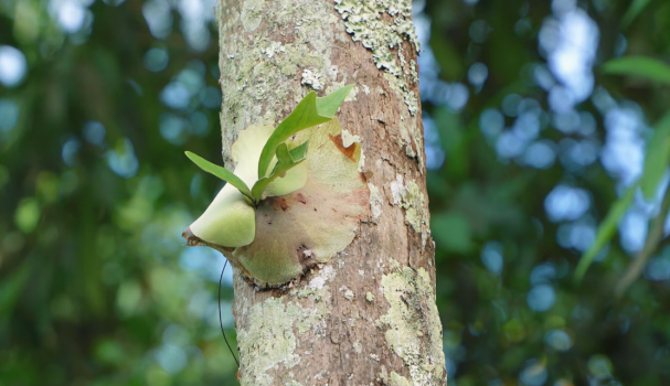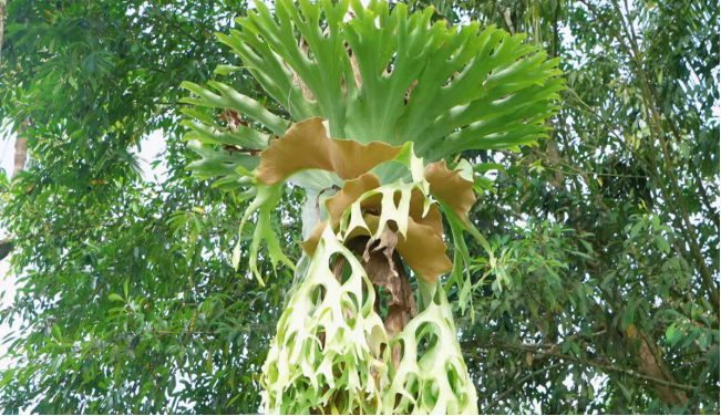 正是凭借这种极致的生存策略,鹿角蕨成为了构建热带雨林“空中花园”的重要成员。它们和附生兰花、凤梨等附生植物一起,极大地增加了森林生态系统中空间的生物多样性,为多种昆虫、蛙类甚至鸟类提供了栖身之所和食物来源。
