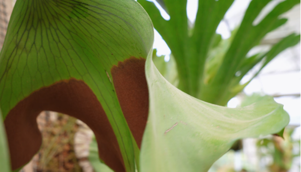 首先,我们看,向上直立的这部分叶片,叶片围合起来,像不像一顶霸气的皇冠?这就是鹿角蕨的“营养叶”。营养叶的一个功能是进行光合作用,另一个功能还像是一个“空中垃圾筒”,将雨林中刮风下雨带来的尘土、树叶、昆虫残骸等收集起来,这些有机物在里面随着时间会逐渐分解,形成鹿角蕨的专属“营养袋”,供其生长使用。