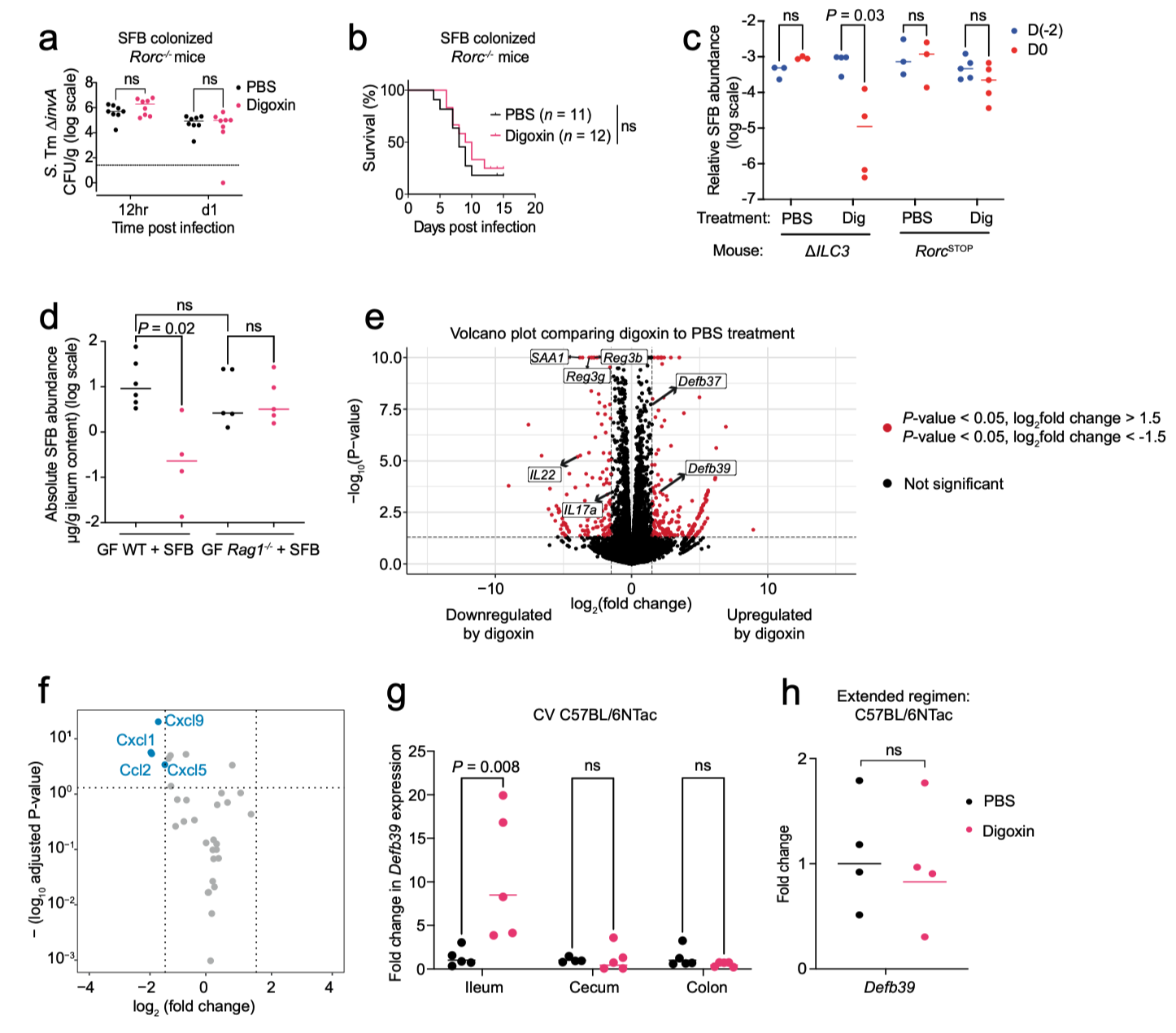 (地高辛响应中 RORγt 与肠道 β-防御素 的作用特征。a,b:PBS 或地高辛预处理对 SFB 定植小鼠感染 S. Tm ΔinvA 的影响,包括病原负荷和死亡率;c–d:不同基因型小鼠中 SFB 水平的变化;e:地高辛处理后小肠差异基因的火山图。)