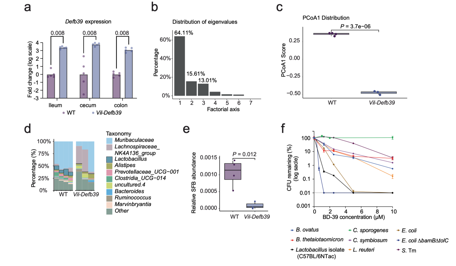 (Defb39 对肠道共生菌影响的表征。a:不同组织中 Defb39 表达;b–e:基于16S测序的群落组成差异分析,显示 Lactobacillus 显著下降;f:纯化 BD-39 对人和小鼠肠道代表菌株活性的剂量效应。)