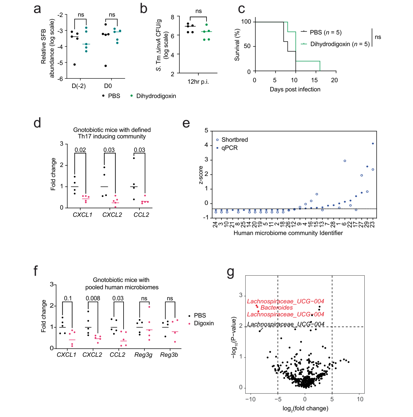 (地高辛对携带人源菌群小鼠的作用。a–c:常规饲养 C57BL/6NTac 小鼠给予 PBS 或 二氢地高辛 (5 mg/kg) 处理后的结果。)
