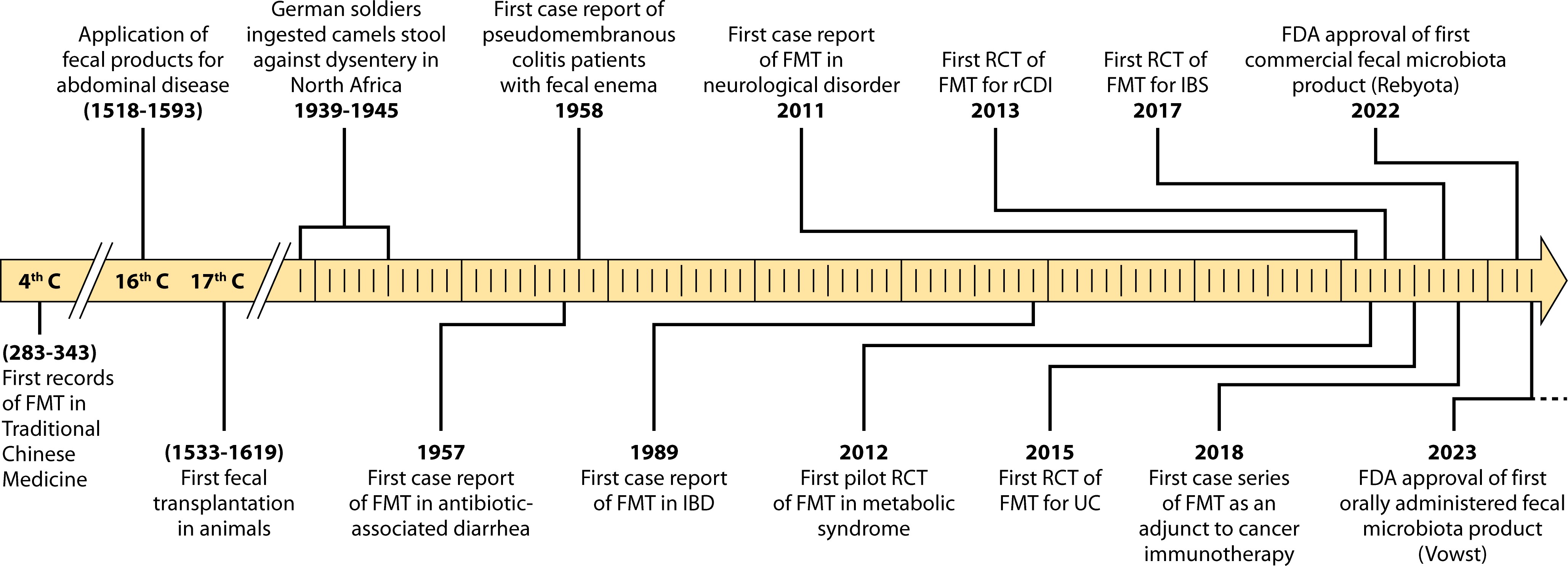 图中展示了 FMT 从个案救治、病例系列研究,到随机对照试验与标准化制剂开发的时间线。技术逐步规范化,也带来了伦理与监管体系的建立。