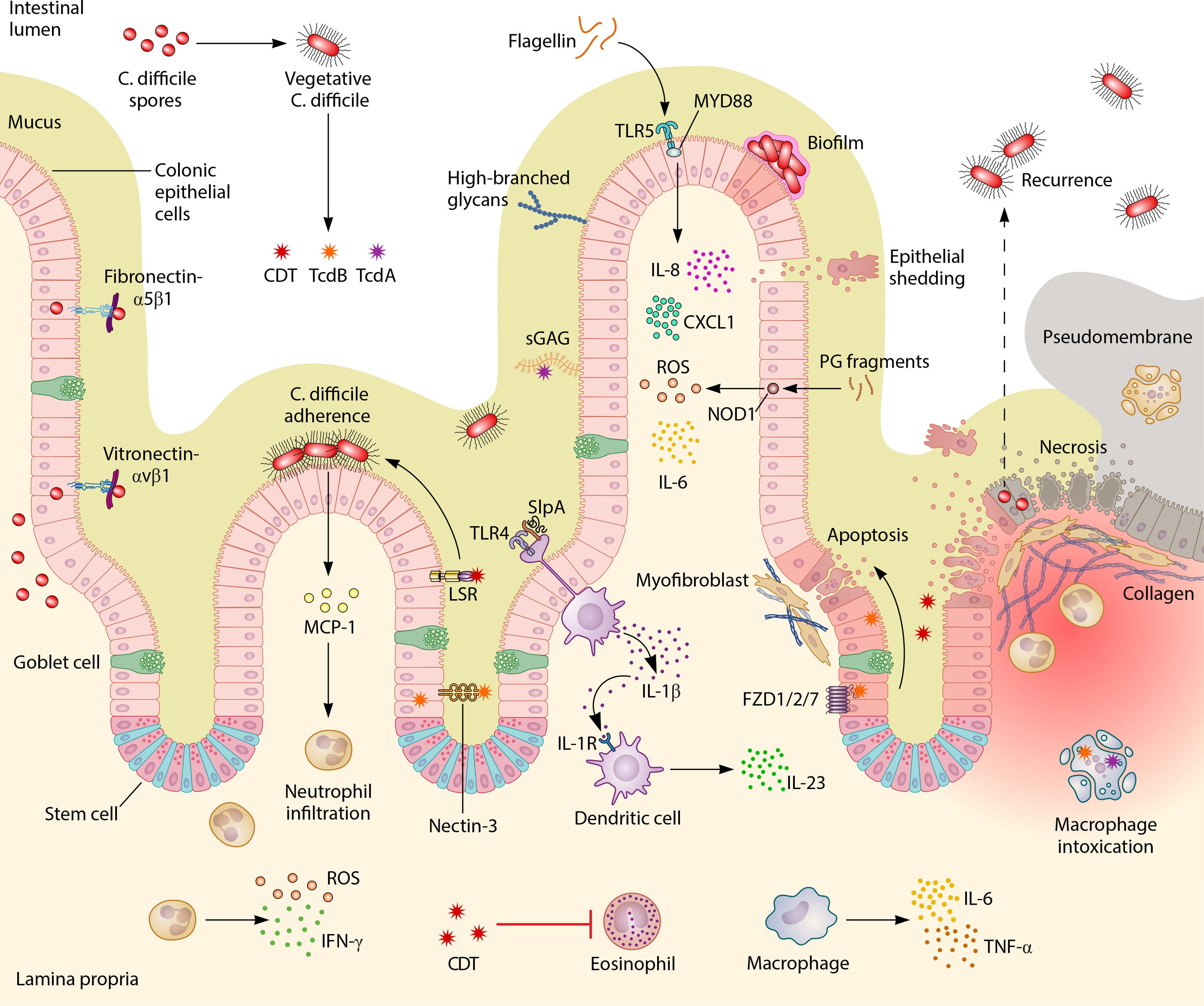 TcdA 通过糖链和硫酸糖胺与宿主上皮结合,TcdB 的受体包括糖链、nectin 3、CSPG4 和 FZD1/2/7。CDT 毒素通过 LSR 结合后被蛋白水解,其活性亚基 CDTa 破坏肌动蛋白骨架,促进黏附。C. difficile 的细胞壁肽聚糖可通过 NOD1 激活中性粒细胞趋化;表面层蛋白和鞭毛分别激活 TLR4 和 TLR5 信号通路,引发炎症。
