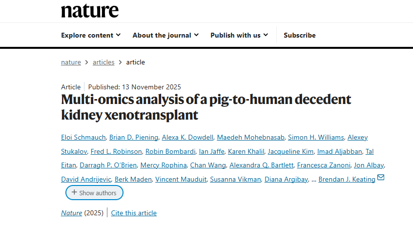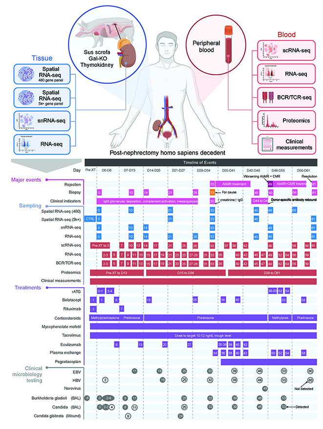 面对全球性的器官短缺危机,基因编辑猪器官被视为挽救生命的希望之光。然而,即使经过基因编辑,跨物种移植后强烈的免疫排斥反应仍是导致移植失败的主要障碍。以往,我们对于人体如何具体响应猪器官的认知存在大量空白。近日,一项发表于顶级期刊《Nature》的重磅研究,首次通过多组学分析技术,详细、动态地描绘了猪肾脏移植到一位脑死亡受体体内61天内的完整免疫过程,勾勒出一张详尽的“免疫反应路线图”。
