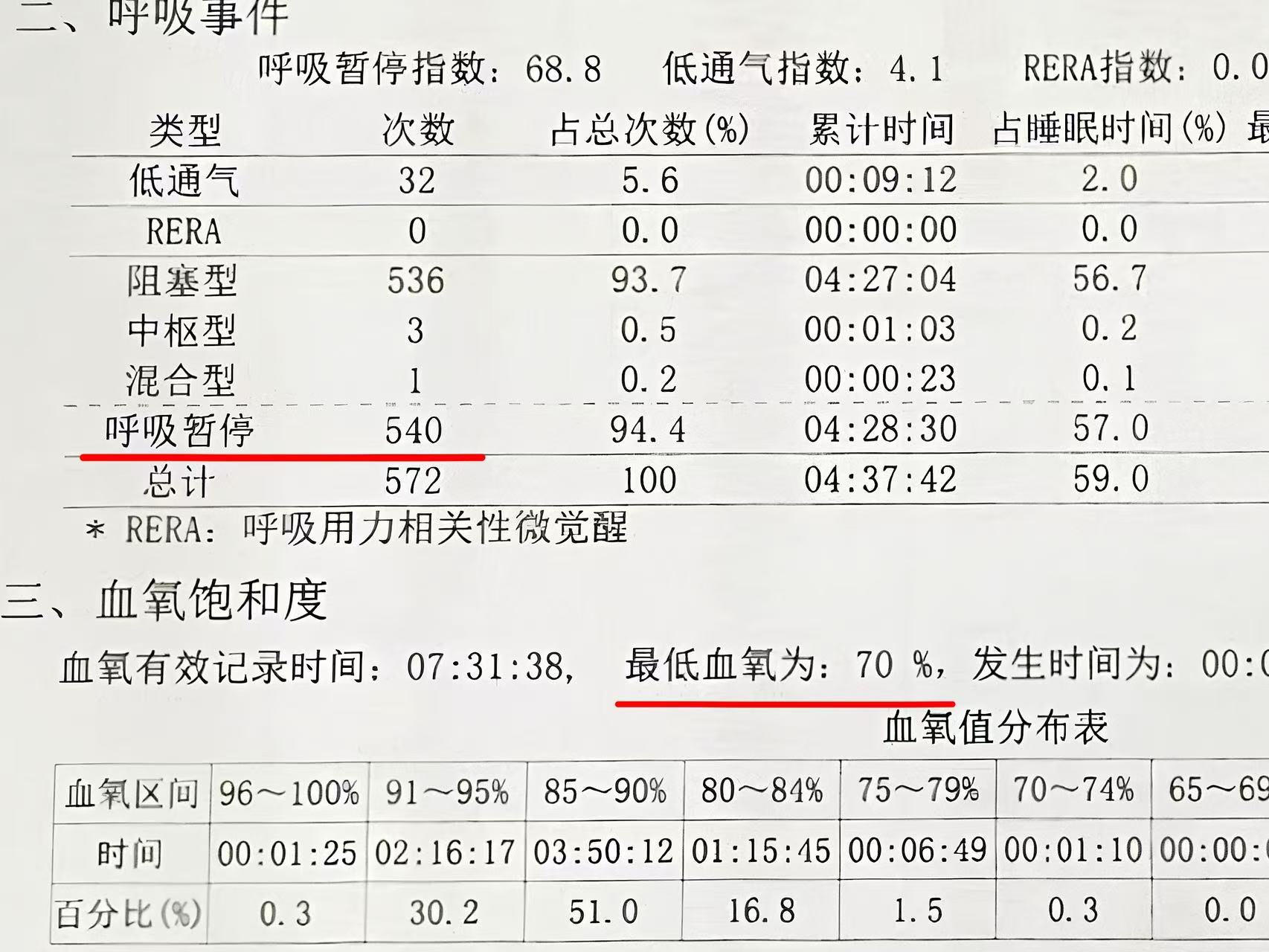 睡眠监测显示:其呼吸暂停指数高达68.8,一晚上呼吸暂停540次,最低血氧饱和度仅70%(正常人>95%),属于重度阻塞性睡眠呼吸暂停低通气综合征。