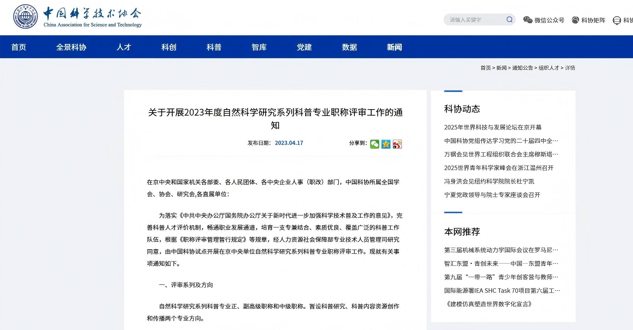 2023年4月,中国科协率先在在京中央单位启动科普专业职称评审试点,拉开了科普人才专业化评价的序幕。随后,全国各地积极响应,一场科普职业化改革浪潮席卷而来——