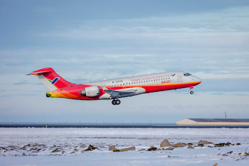 例如,在寒冷条件下,飞机必须具备可靠的发动机启动能力和油路供给稳定性。2010年1月,C909在呼伦贝尔东山国际机场完成高寒地区地面与飞行试验,验证了燃油系统、发动机启动性能以及航电系统的低温可靠性。紧接着,在海南三亚完成高温高湿试飞,确保其能够应对南方沿海和热带地区运行环境。