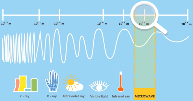 电磁波按照不同的“波长”或“频率”可以分为无线电波、微波、红外线、可见光、紫外线、X 射线和伽马射线等。微波是电磁波的一种,通常指波长大约在1 mm到1 m之间、频率在300MHz到300GHz范围内的电磁波,在电磁波谱中处于无线电波和红外线之间。它的这种高频特性使得它能够携带更多的信息,而且由于微波还可以穿透电离层,使得它在通信领域有着重要应用。