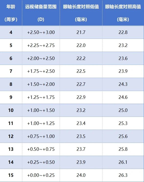 更为关键的是,这种消耗是渐进且隐匿的。根据全国综合防控儿童青少年近视宣讲团开展的儿童青少年近视发生发展不同阶段防控指引研究,不同年龄段有着对应的正常远视储备范围(详见下图),当孩子的储备值低于同龄人正常范围的下限时,就亮起了近视的“预警红灯”。