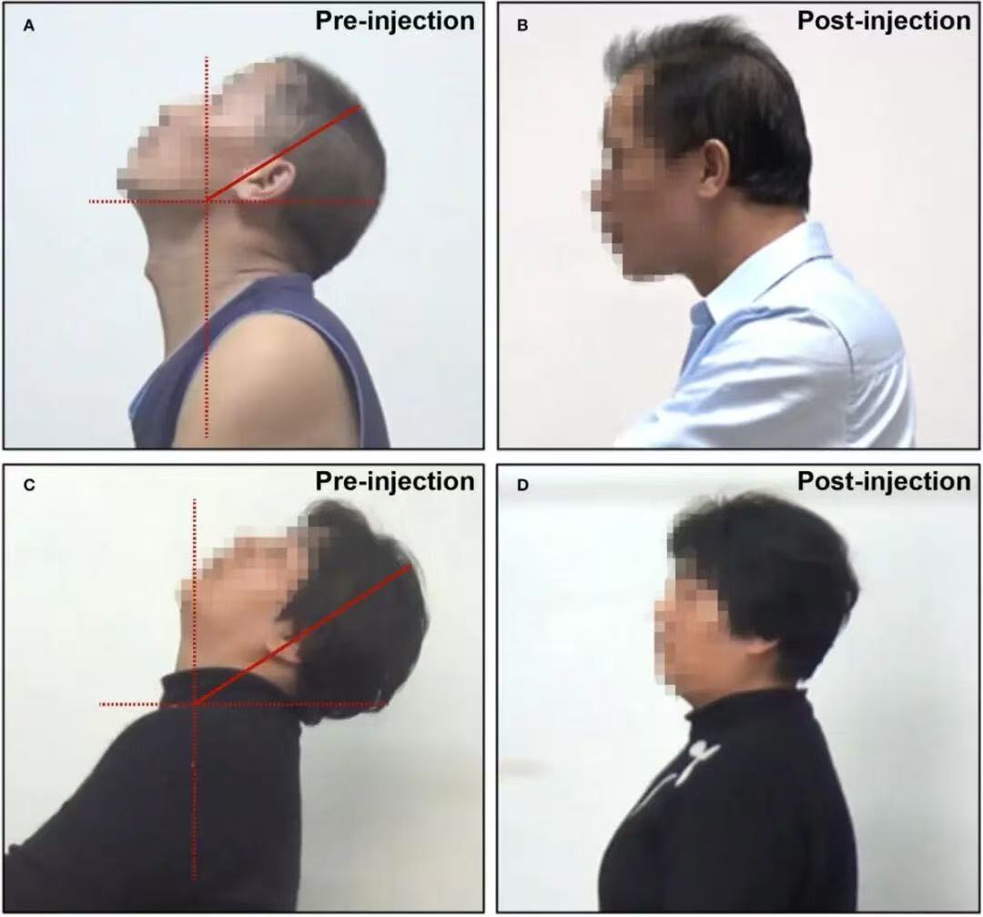 RCD患者的代表性图片。(A)BTX-A注射前的头后;(B)BTX-A注射后的头后;(C)BTX-A注射前的颈后;(D)BTX-A注射后的颈后。(来源于文献:Front Neurol. 2022 Jul 26;13:952456.)