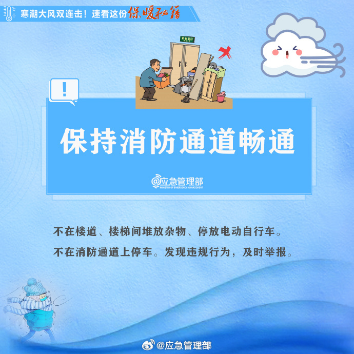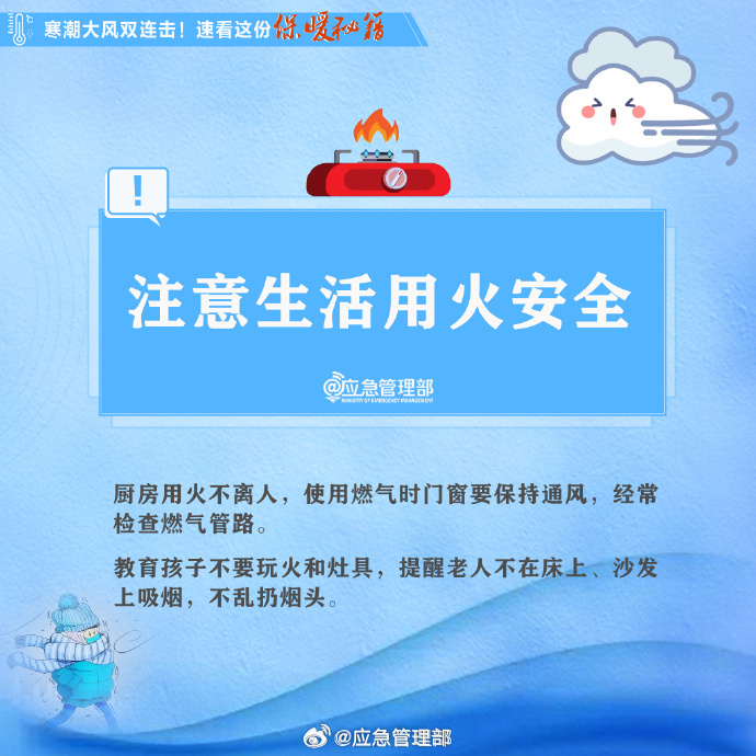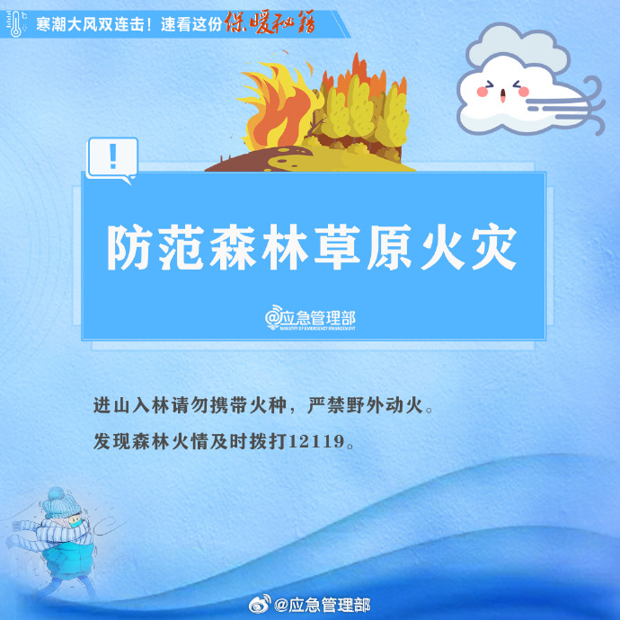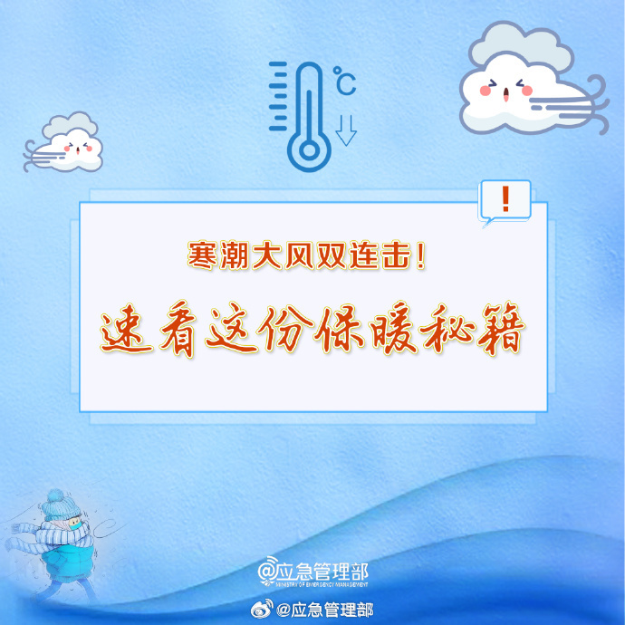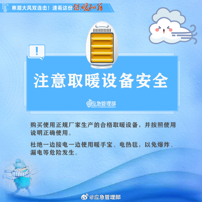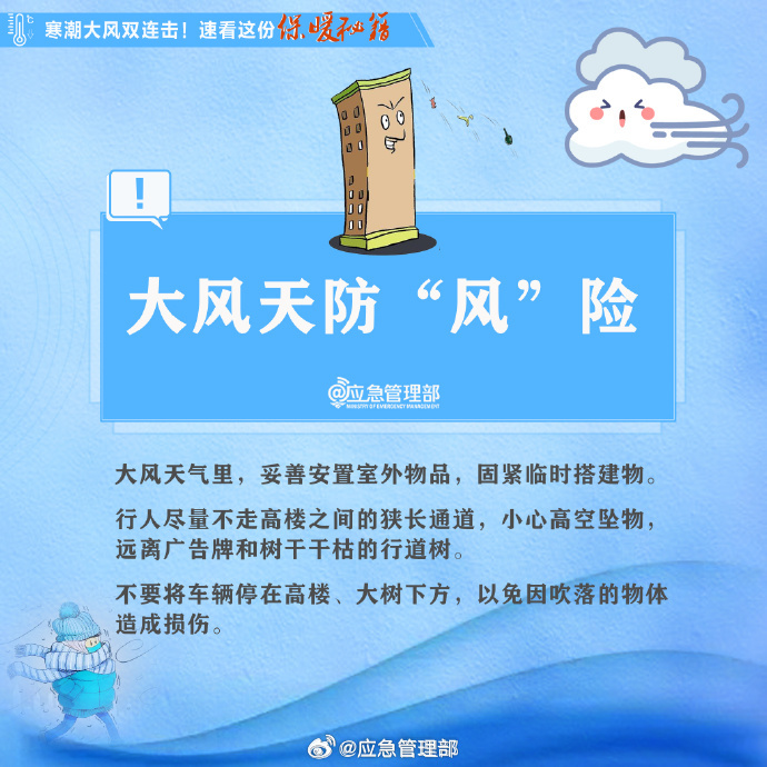 提醒大家:寒潮裹挟大风来袭,出行记得做好防寒保暖措施,使用取暖设备时需注意用火、用电安全。体弱人群和心脑血管疾病患者尤其需要关注气温变化,做好健康防护。