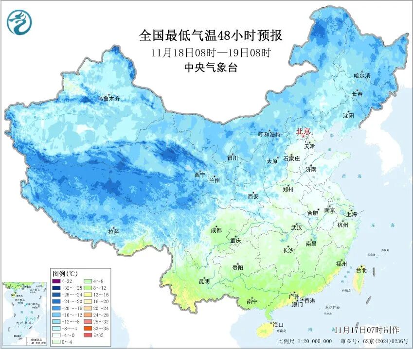受强冷空气影响,预计,11月17日14时至11月19日08时,黑龙江东北部、陕西南部、四川北部和东部、重庆、江汉、江淮、江南、华南以及贵州、云南东部等地日平均或最低气温下降6~10℃,其中,重庆北部、湖北西部、江淮东部、江南北部、广西东部等地的部分地区降温10~12℃,安徽南部、浙江西北部局地降温可超过14℃。19日凌晨,最低温度0℃线将南压到苏皖南部至湖北中部一带。