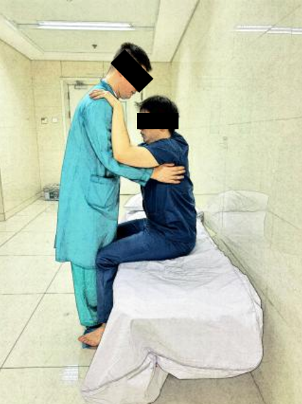 4.站立 坐稳后双手搀扶陪护人员,将重心缓慢转移至对方,缓缓站起。坐起后不宜立即站起,应先静坐片刻,确认无头晕、恶心、心慌等不适后再进行站立。初期建议在床旁活动,预防跌倒,陪护人员需全程陪同。如出现不适,应立即卧床休息。具体方法:患者坐于床沿,与陪护人员面对面,双手搭在陪护人员双肩,陪护人员双手放置在患者腋下,协助其缓慢站起。站起后可先原地踏步,适应后再尝试行走。