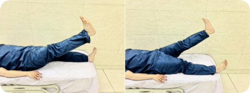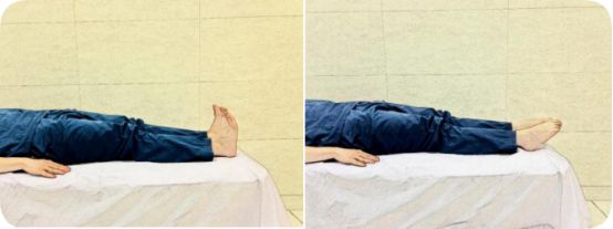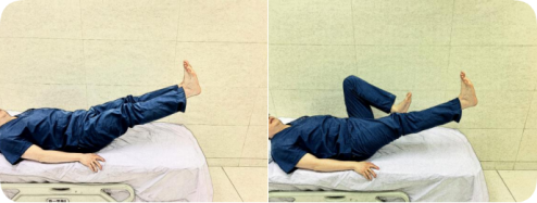1.直腿抬高运动(每日2次,每次12~15组) ①平躺,腿部伸直; ②以臀部为支点,依次缓慢抬高双腿。平躺时先勾脚尖,保持踝关节呈90°,缓慢抬腿使大腿与床面的角度呈30°~40°(以不引起伤口疼痛为度),维持数秒,感到疲惫时缓缓放平,两腿交替进行。