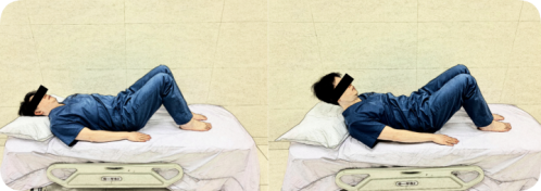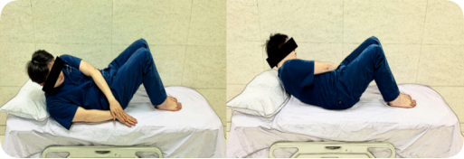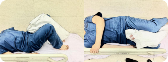 2.轴线翻身 ①屈膝,双膝间夹一枕头;②肩部与臀部作为整体,同时同轴转向一侧。翻身前需身体放松,双膝弯曲,双脚踩床。若向左侧翻身,可将右手向左侧床挡借力,确保肩部与髋部呈直线实现同步翻转。