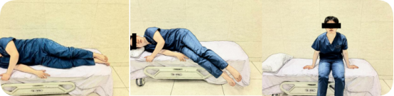 3.坐起 ①轴线翻身至侧卧;②双腿移离床沿,用一侧手肘与对侧手掌支撑床面;③缓慢推起上身至坐直,双手掌支撑于床面。术后首次下床时间须遵医嘱,并在医护人员指导下进行,之后可逐步尝试自主完成。