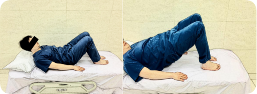 3.抬臀拱桥运动(每日2次,每次12~15组) ①平躺,双膝屈曲; ②以足跟和肩部为支点,向上抬臀,使身体呈拱桥状。