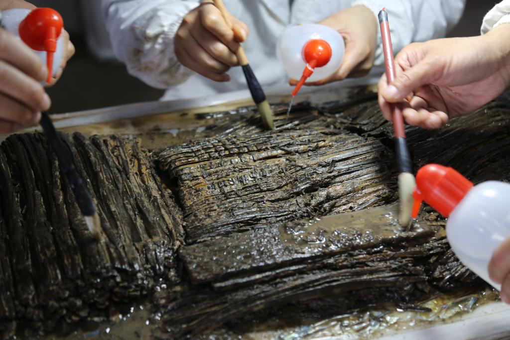 图为文保人员正在进行竹简保护工作。江西省文物考古研究院供图