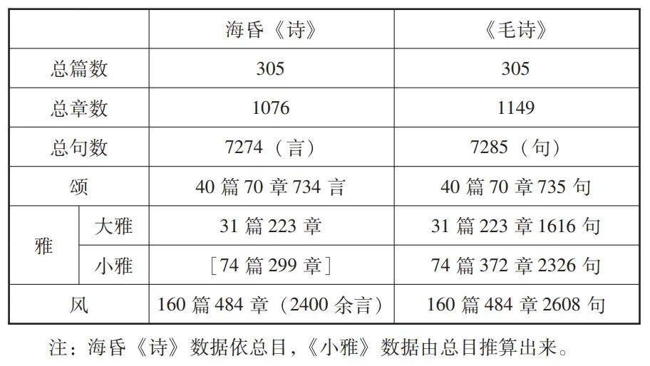 朱凤瀚《西汉海昏侯刘贺墓出土竹简〈诗〉初探》对比海昏侯《诗》简的目录与今本《诗经》(表中称“毛诗”)的表格。二者的数值比较接近,可见这些竹简“本应”包含基本“完整”的《诗经》。