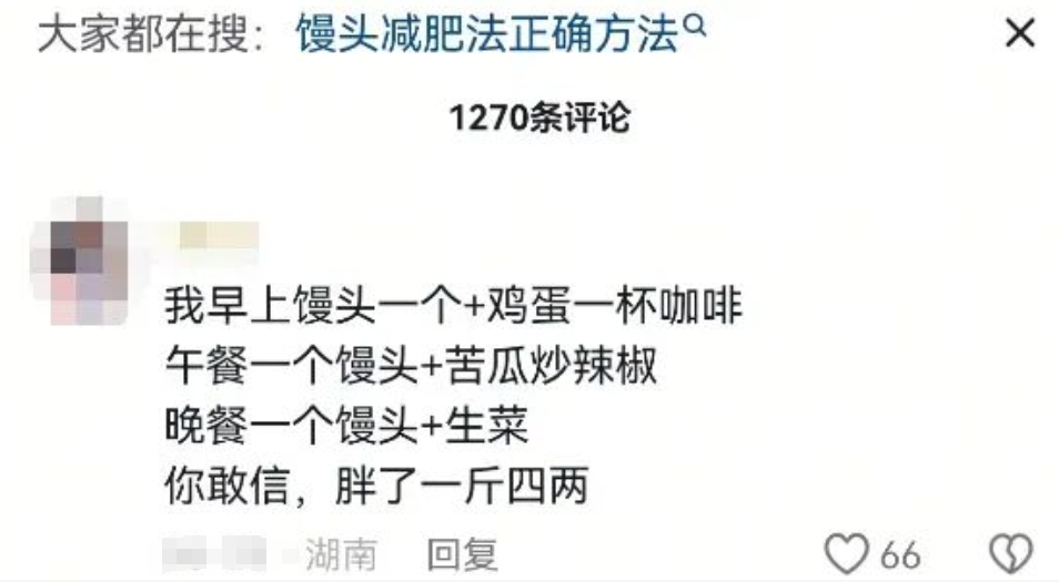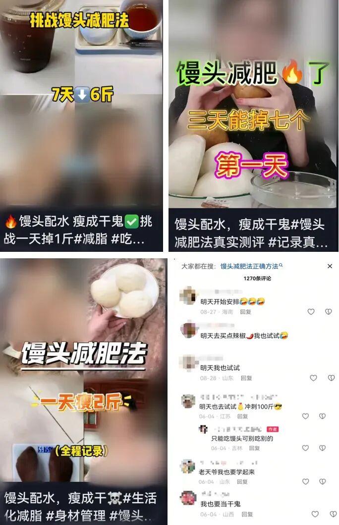 “馒头配水,瘦成干鬼”。这阵子,社交平台一种“馒头减肥法”火了。很多博主开始了馒头配水减肥法挑战,晒出自己一日三餐只啃白馒头的视频或照片,期待着轻松实现体重的断崖式下跌,评论区也有不少人跃跃欲试。