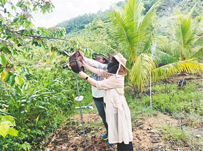 采访时,一张杨艳和同事在椰子种植园里搭建蜂巢的照片,引起了记者的注意。原来,为了增强生态系统的稳定性,他们在探索吸引更多传粉野生蜂“光临”椰林。