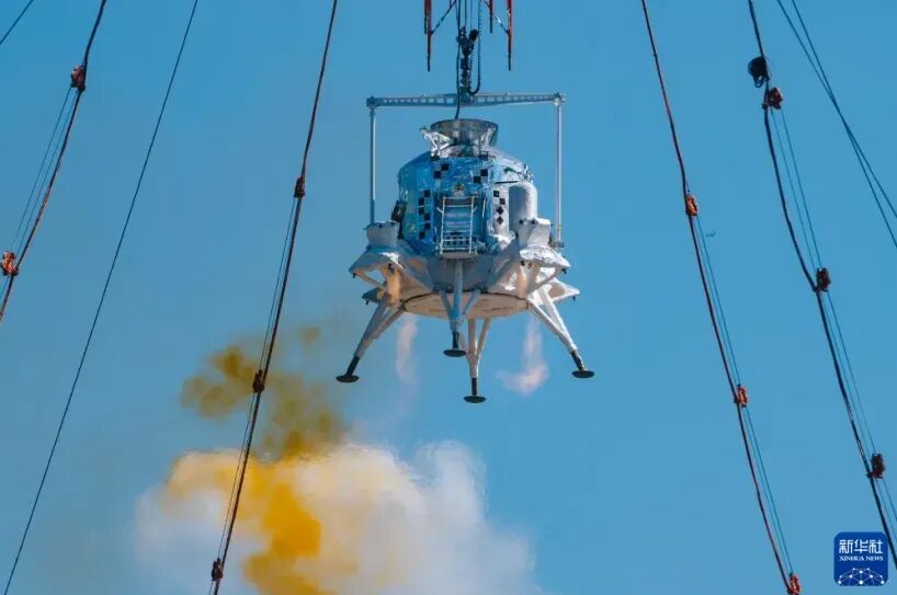 揽月月面着陆器着陆起飞综合验证试验过程,可看到发动机处于工作状态(图片来源:新华社)**月面着陆器是实现载人登月目标的关键一环。**目前该计划总体进展顺利:2025年6月,我国新一代载人飞船“梦舟”成功实施了零高度逃逸飞行试验,为航天员的安全提供坚实的保障;2025年9月,我国成功实施了长征十号运载火箭的第二次系留点火试验,接下来的首飞更加令人期待;文昌航天发射场的相关配套设施等也在稳步推进中。一切都在为2030年前中国航天员踏上月球表面做准备。