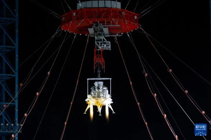 试验场地通过一系列机械装置模拟月球表面重力环境(图片来源:新华社)在地球上模拟月球环境是一大难题。试验场通过塔架、钢缆等组成的随动系统,来模拟月球表面的微重力环境,并实时跟踪登月舱的飞行轨迹。由于测试是在地球表面进行,必须通过这些特殊装置来模拟月面重力场,以满足测试条件。同时,测试场地的地面也按照月球表面的环境特点进行针对性的设计和部署,不仅设置了模拟陨石坑,还铺撒了类似月壤的岩石碎粒,尽可能真实地还原月球表面的地形特征。这些精心设计的细节,为着陆器提供了最接近真实的试验条件,确保测试结果能够真实反映其在月面的表现。