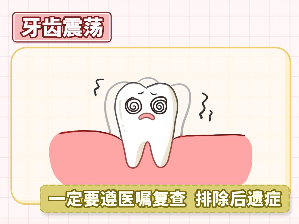 牙齿震荡最常见的并发症是牙髓炎症,甚至牙髓坏死,一旦发生应及时治疗。而且要注意的是,牙外伤后牙髓问题常不是立刻显现,可能外伤初期牙齿看起来没问题,反而容易在3-6个月后出现状况。所以无论震荡轻重,一定要带孩子去医院复查,排除后遗症。对于牙髓的状态,至少需要持续监测一年,对刚萌出不久的恒牙,应观察至牙根发育完成。