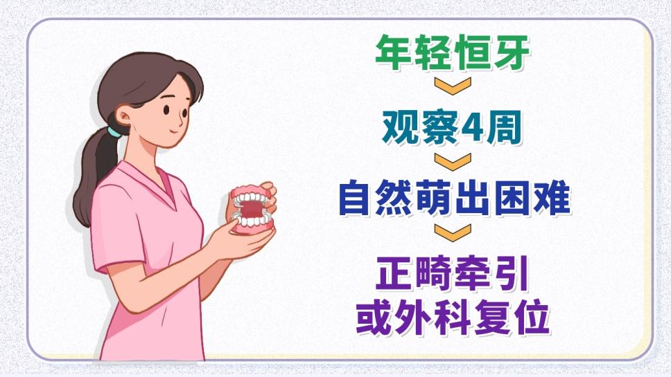 对于牙根未发育完成的年轻恒牙,因为有自然萌出潜力,优先考虑观察4周。如果4周后完全没动静,甚至牙齿变得更“牢固”,说明自然萌出困难,就需要做“正畸牵引”或“外科复位”,通过专业手段慢慢把牙齿拉回正常位置,避免出现牙-骨固连(表现为敲击时有金属音),导致严重不良后果。