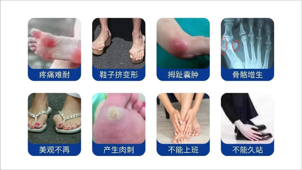 这种畸形并非突然形成,而是一个渐进性过程。早期仅表现为大脚趾轻微倾斜,无明显疼痛;中期跖骨内侧骨赘逐渐增大,穿紧鞋时突出部位受挤压摩擦,出现红肿、疼痛,行走时疼痛加剧;晚期畸形进一步加重,大脚趾可能与第二脚趾重叠,形成“骑跨趾”,同时伴随足底老茧、鸡眼、足底筋膜炎等并发症,严重影响足部功能和生活质量。