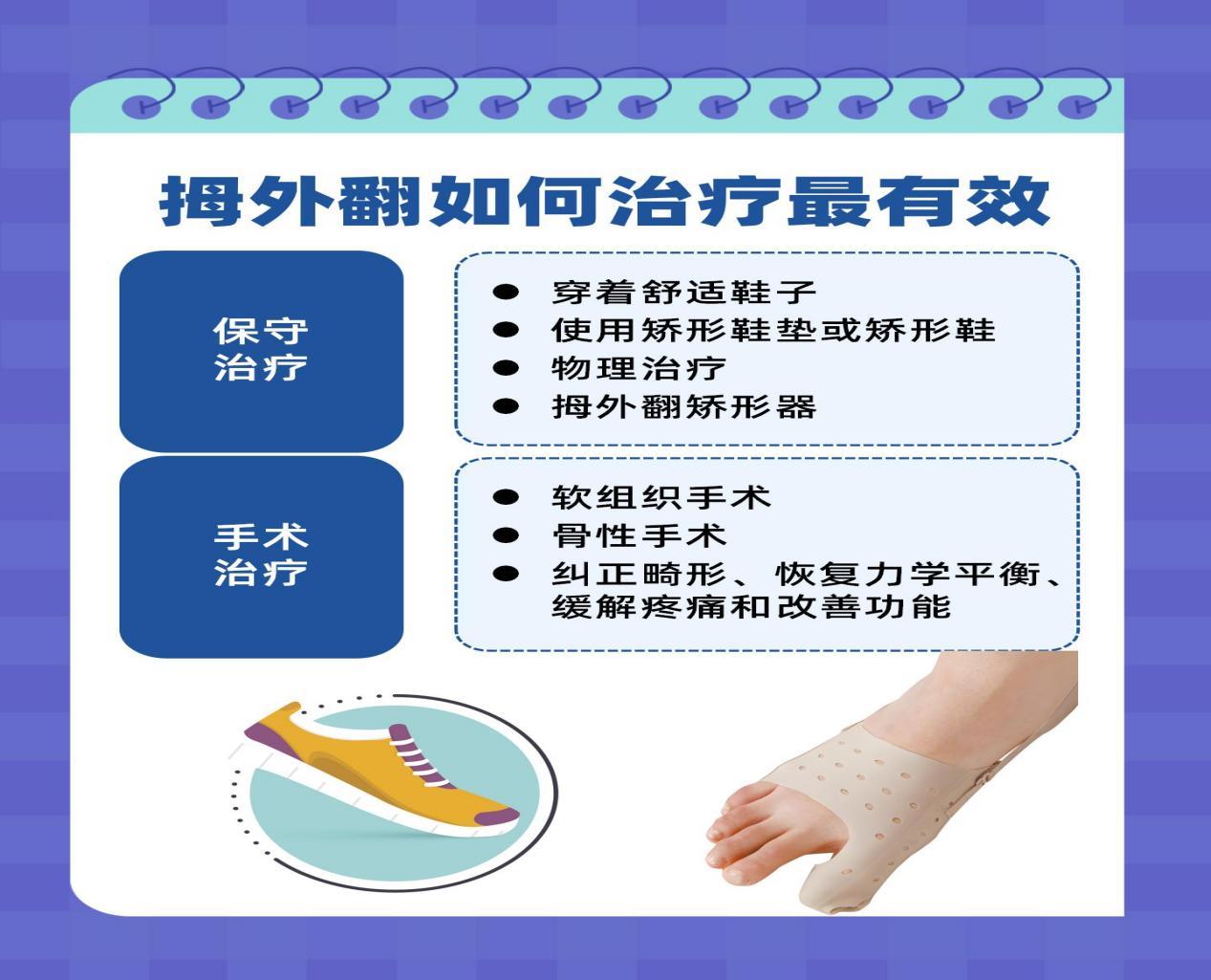 根据畸形严重程度,踇外翻的治疗分为保守治疗和手术治疗两类,治疗原则是“早发现、早干预,分期治疗”。