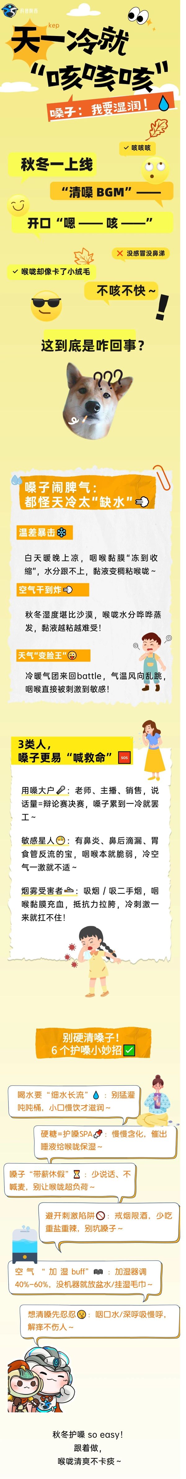 图文简介: 秋冬的“隐藏暴击”,大概就是毫无预兆的嗓子干痒!明明没生病,却总忍不住“咳咳咳”,说话自带“磨砂质感”~其实这不是嗓子在“矫情”,而是干燥冷空气在悄悄“搞事情”!
