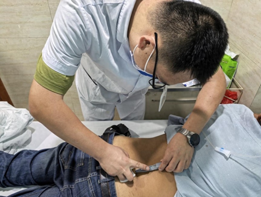 治疗在病房进行,过程短暂轻松。医生先精准触诊,在张先生腹部、臀部等与盆底肌筋膜相关的“患肌”周围确定进针点;接着使用一次性浮针针具轻柔刺入皮下,手持针柄在浅筋膜层进行富有节奏的“扫散”运动。